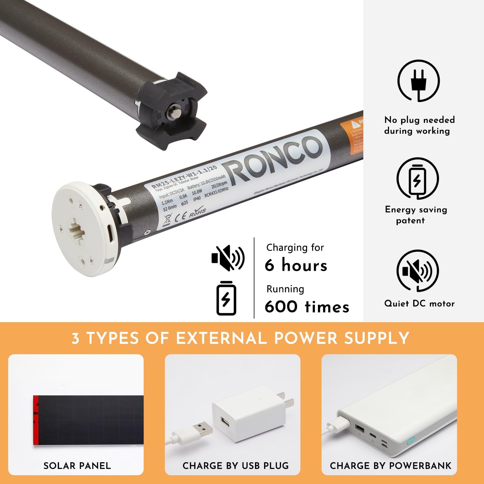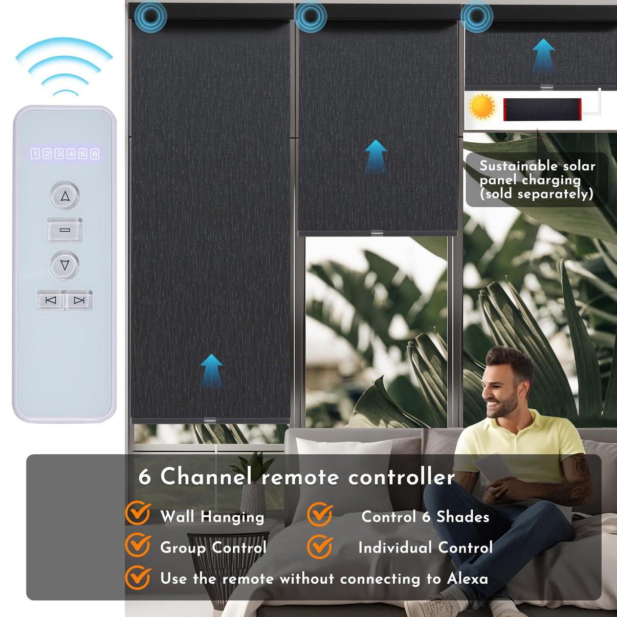 - 【Smart Motor】Built-in rechargeable battery motor can be used for months once fully charged, paired with a solar panel (Please order if need), no need to worry about charging problems anymore. It needs an RF hub/bridge (Please order if need) to connect to Alexa, Google Assistant, etc.【6-Channel Remote】can control 6 blinds separately and simultaneously.