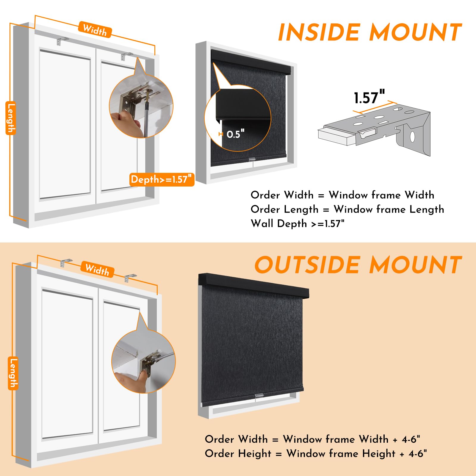 - 【Measurement】[Inside Mount] minimum window frame depth is 1.57". Please give exact the inside window/door frame size, do not make any deductions when you are measuring. The manufacturer will be sure to make them a perfect fit. 【Outside Mount】give the measurements of the space you want to cover from left to right and top to bottom. Keep in mind that height includes valance/cassette. We recommend adding 4" on both width and height to minimize light leakage.