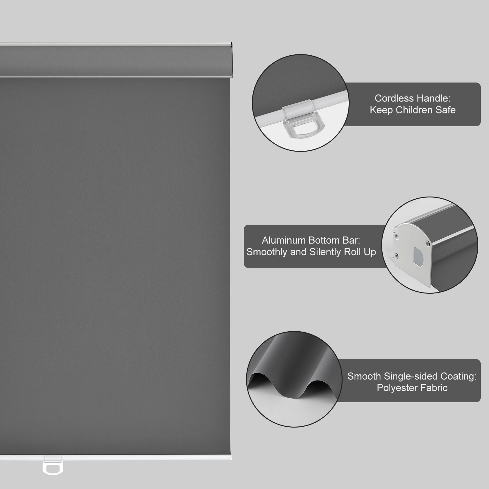【Safety Cordless Design】 The best safety solution for children and pets. The shade can be positioned at any level to provide varying degrees of privacy. The stainless steel bottom rod has a simple, elegant design with hidden screws in the valance. The mechanism allows smooth and quiet roll-up speed, letting you adjust shades up and down silently. Ideal for indoor spaces such as patios, home offices, and living rooms.