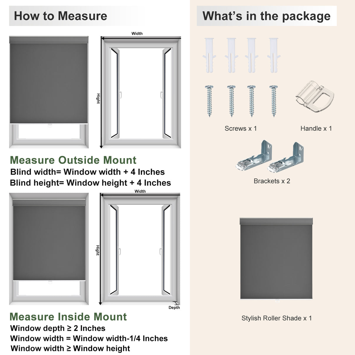 - Inside Mount: Window width = blind width, window height = blind height. Example: Blind Width = 23"; Blind Height = 72".
